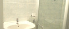 Links neben dem Eingang befindet sich ein Badezimmer mit Handwaschbecken und Dusche. Daneben ist die separate Toilette angeordnet.
