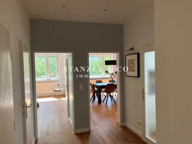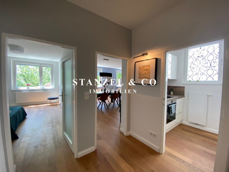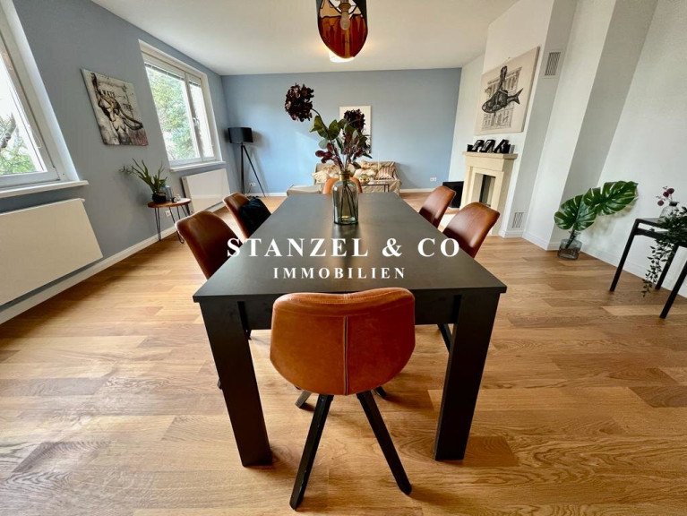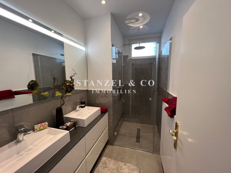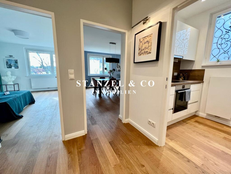 Vom Vorzimmer gelangt man in das sonnige, südwestseitige 40m² große Wohnesszimmer mit offenem Kamin, welches in ein 21m² großes Wohnzimmer und 18m² großes Schlafzimmer abgetrennt werden könnte. Das Apartment verfügt über ein Schlafzimmer, mit anschließendem 7m² großen Kabinett, welches als Kinderzimmer oder Arbeitszimmer genutzt werden kann. Die Küche ist mit einem Fenster, Ceranfeld + Backrohr, Kühlgefrierkombination, und Geschirrspüler ausgestattet. Das Badezimmer mit bodenebener Glaswanddusche verfügt über einen Doppelwaschtisch mit Unterschrank, Spiegel mit Beleuchtung, Handtuchtrockner, elektrischer Entlüftung und ein Fenster. Das WC mit elektrischer Entlüftung und einem Handwaschbecken ist separat. Des Weiteren gibt es einen Abstellraum mit Waschmaschinenanschluss.