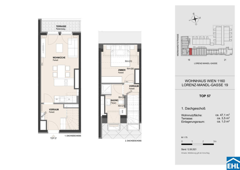 Die Wohnung befindet sich im 1. und 2. Dachgeschoß und verfügt über einen großzügigen Wohnraum mit voll ausgestatteter Küche, sowie einen Vorraum und eine Terrasse im unteren Stockwerk. Das Schlafzimmer, Badezimmer mit Dusche, WC und Waschmaschinenanschluss befinden sich im oberen Stockwerk.