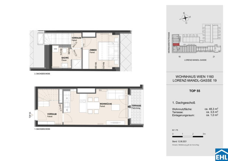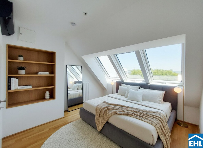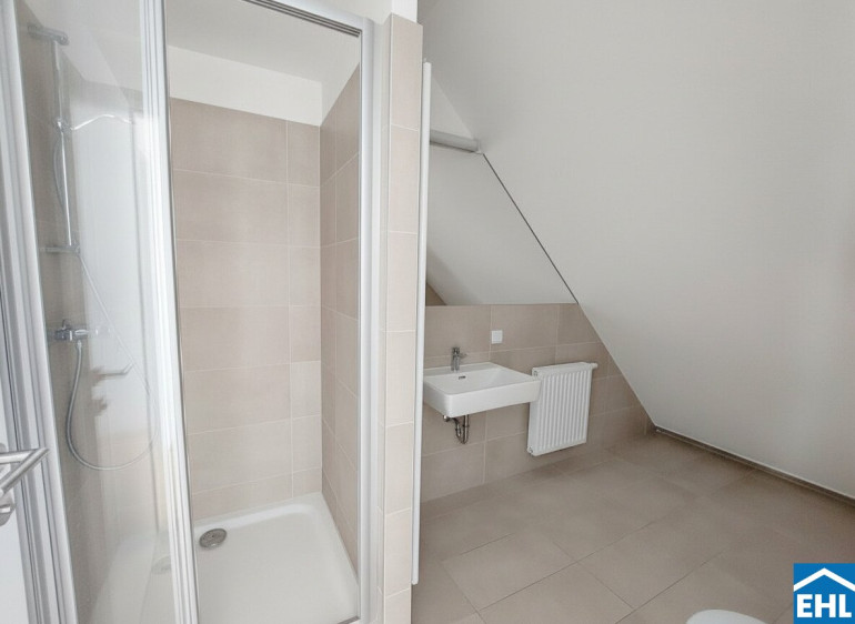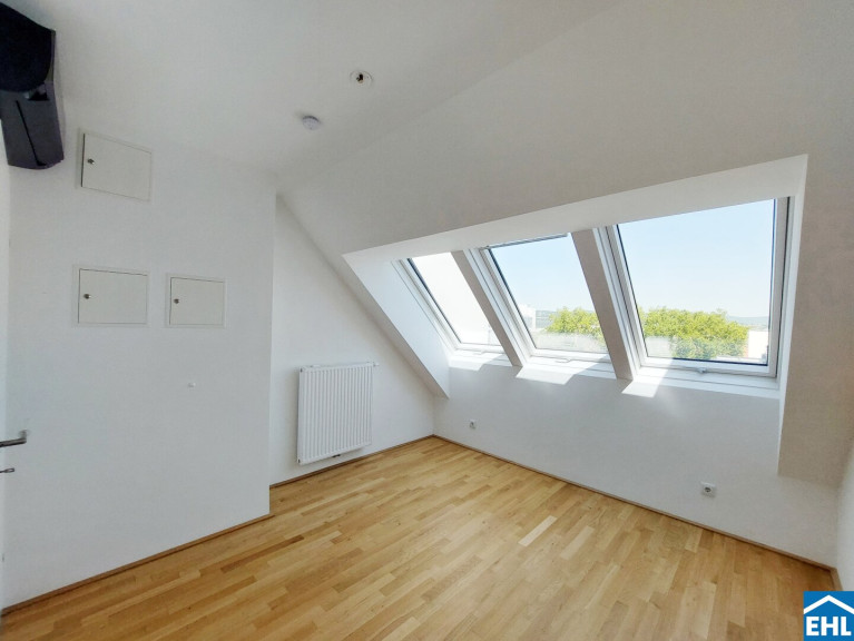 Die Wohnung befindet sich im 1. und 2. Dachgeschoß und verfügt über einen großzügigen Wohnraum mit voll ausgestatteter Küche, sowie einen Vorraum und eine Terrasse im unteren Stockwerk. Das Schlafzimmer, Badezimmer mit Dusche, WC und Waschmaschinenanschluss befinden sich im oberen Stockwerk.