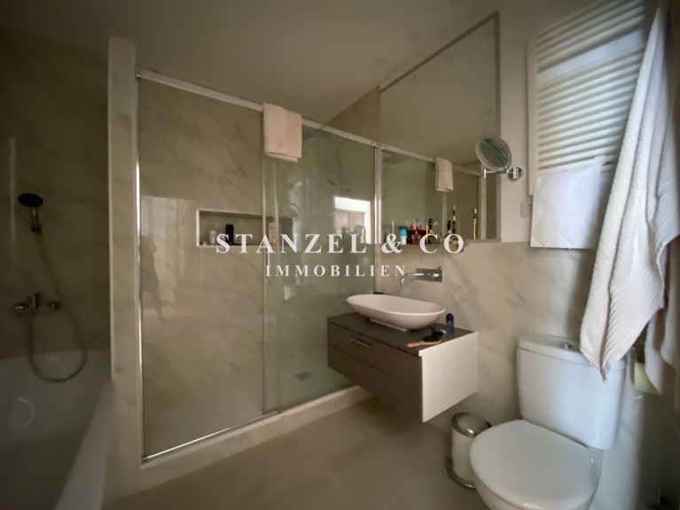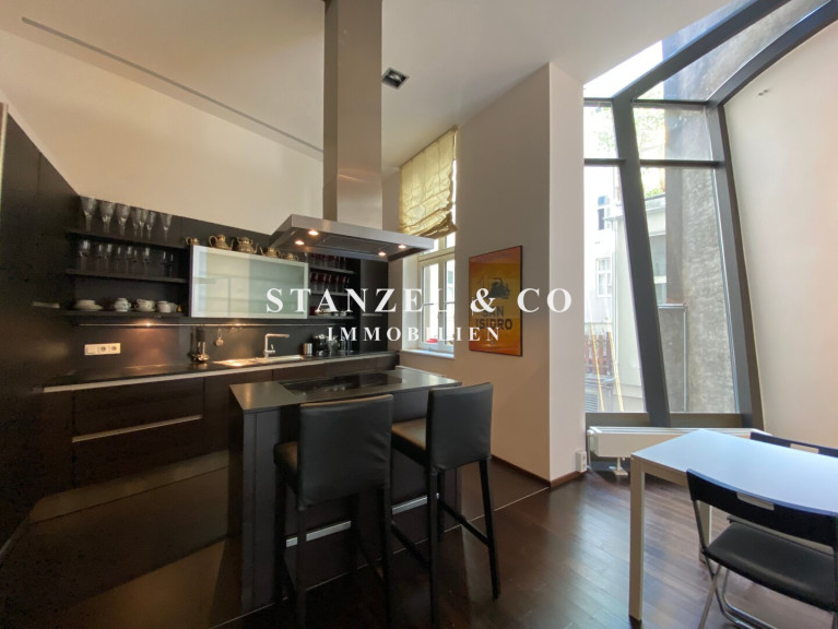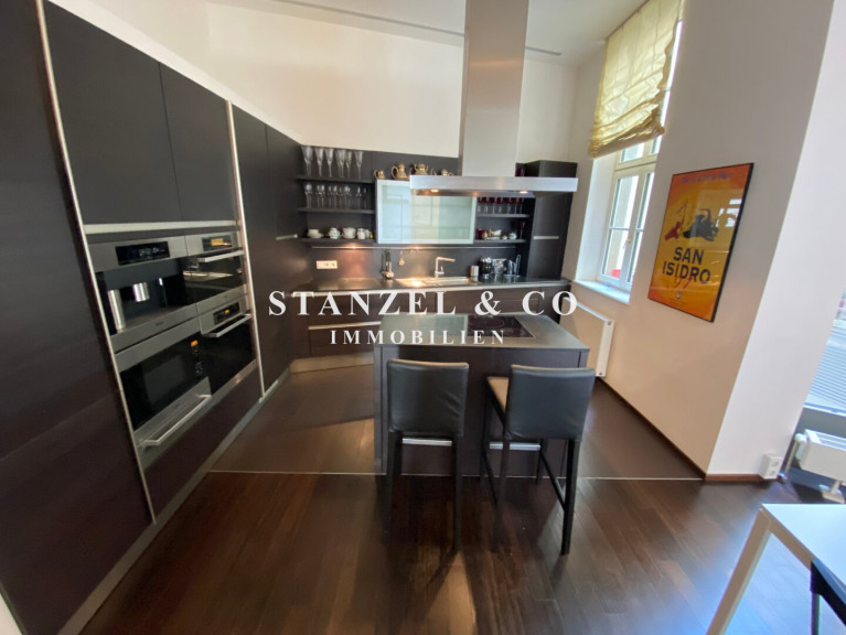 Die große moderne Wohnküche mit Miele-Geräten und Kochinsel, ist hochwertig ausgestattet und verfügt über ein großes Panoramafenster in einen Innenhof. Die beiden ostseitigen Schlafzimmer verfügen jeweils über ein angeschlossenes Badezimmer.