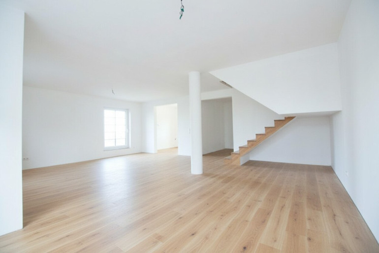 Die Villa verfügt über zwei Autoabstellplätze: einen in der Garage mit Leerverrohrung für einen Elektroanschluss sowie einen Außenstellplatz direkt vor der Tür. Über einen großen Vorraum gelangt man in das ca. 44 m² große Wohn-/Esszimmer. Große Glasfenster und zwei Ausgänge sorgen für Helligkeit und bieten einen schönen Ausblick in den Eigengarten. Der Gartenbereich ist süd-west orientiert und verfügt über eine gemütliche Terrasse. Über das Wohnzimmer ist auch die gut geschnittene Küche begehbar. Auf dieser Ebene befindet sich außerdem ein WC mit Fenster und Handwaschbecken sowie ein praktischer Technik-/Abstellraum.