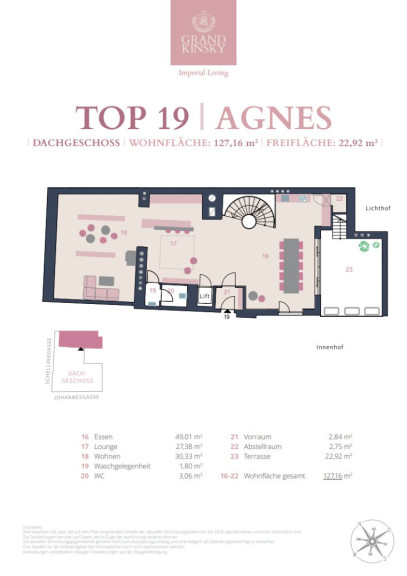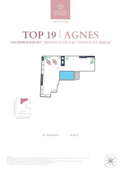 Die Dachebene besteht aus einer einzigartigen Galerie mit weitläufiger Terrasse mit ca. 63 m². Ein privater ca. 7,5 m² großer Nirosta Wateredgepool erwartet Sie auf dieser Ebene, von welcher Sie über die Dächer im Herzen der Wiener Innenstadt blicken. Die Granitblumentröge mit Kirschlorbeer werden automatisch bewässert und ein Sonnensegel spendet generösen Schatten. Auf den Terrassen sind alle Anschlüsse für eine Sommerküche vorhanden.
