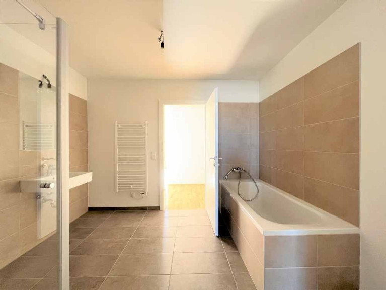 - Badezimmer mit Badewanne und Waschmaschinenanschluss