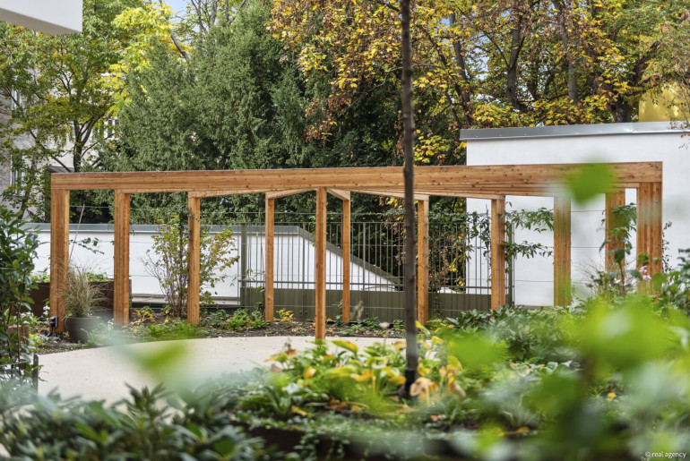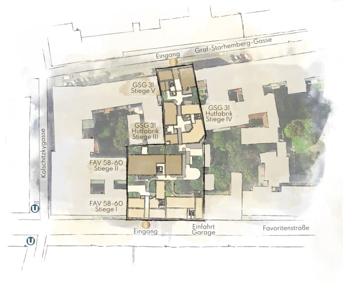 Das Quartier umfasst fünf Baukörper, darunter vier revitalisierte Gründerzeithäuser und die ikonische Hutfabrik. Im Mittelpunkt: ein weitläufiger, wunderschön begrünter Innenhof, der als grüne Oase mitten in der Stadt neue Maßstäbe setzt.