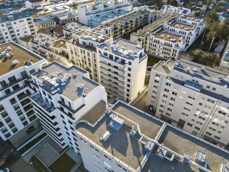 Die Errichtung dieser Wohnhausanlage, aufgeteilt in 5 Baukörper mit insgesamt 121 freifinanzierte Eigentumswohnungen, erfolgte in Massivbauweise.