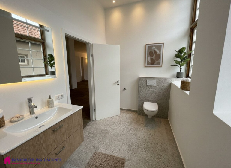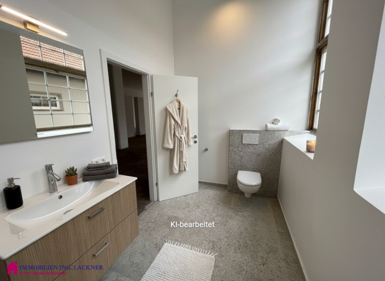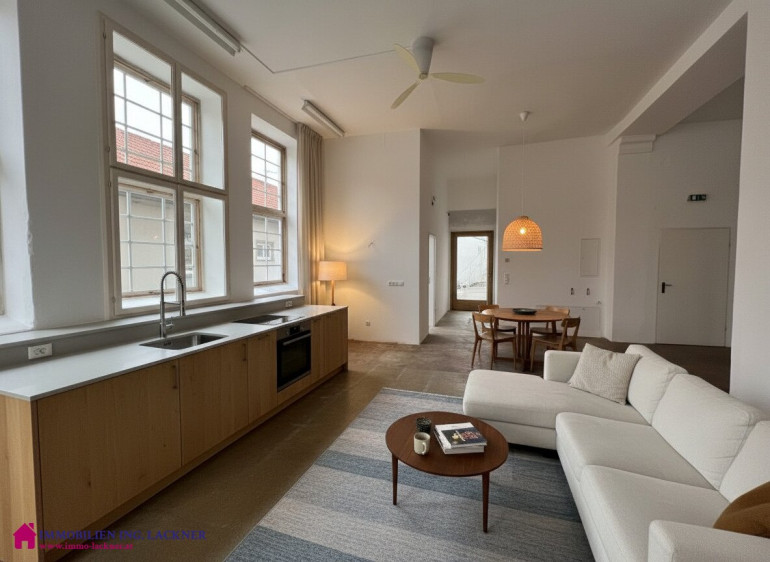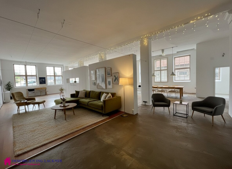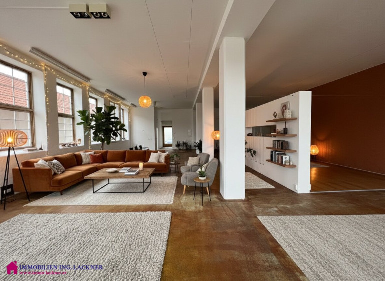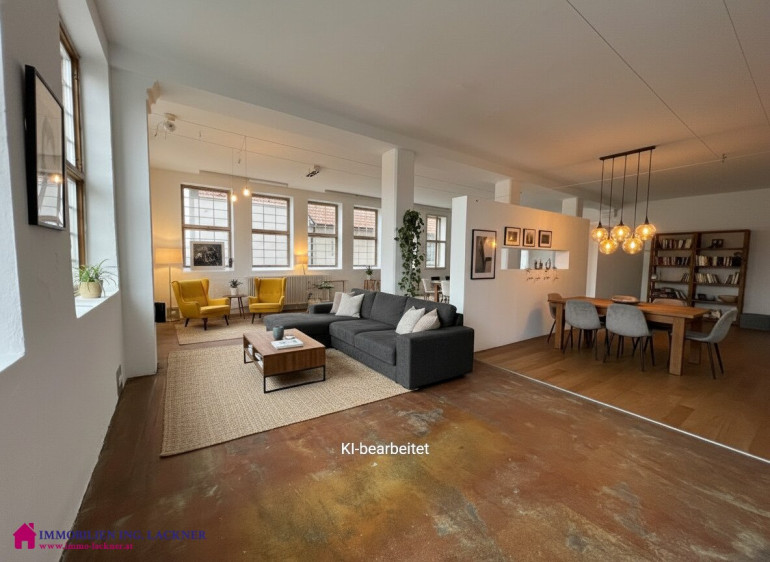 In diesem beeindruckenden ehemaligen Fabrikobjekt (ehemalige Sargfabrik – Tischlerei – Möbelhandel „Wohnen in der Fabrik“) finden Sie dieses große Loft mit ca. 190 m2 Nutzfläche. Der Charme dieses Objektes ergibt sich aus dem hohen Hauptraum mit 3,85 m und den großen Glasflächen die alles hell und lichtdurchflutet machen. Gerade wurde ein neues Bad eingebaut. Die Fenster wurden renoviert bzw. erneuert und ein Kamin steht zur Verfügung. Die Elektrik wurde erneuert. Beheizt wird das Objekt mittels Geothermie, eine Fußbodenheizung ist vorhanden. Der Estrichboden ist eingefärbt und bildet einen tollen Kontrast zum hellen Hauptraum.