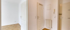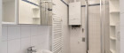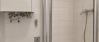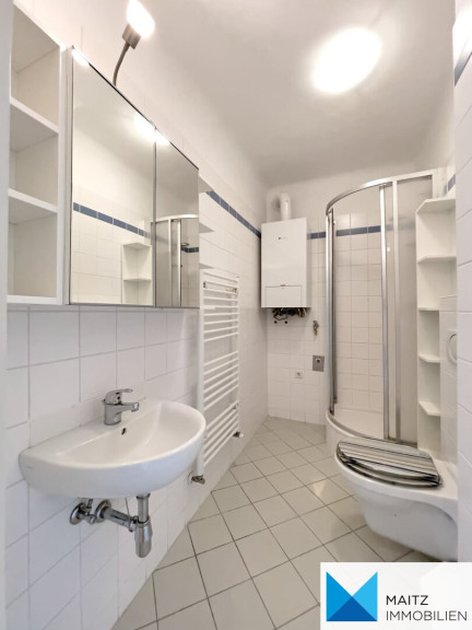 + Bathroom with sink, mirrored cabinet incl. cupboard, towel radiator, shower cubicle, toilet, washing machine connection, small shelf next to the shower