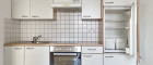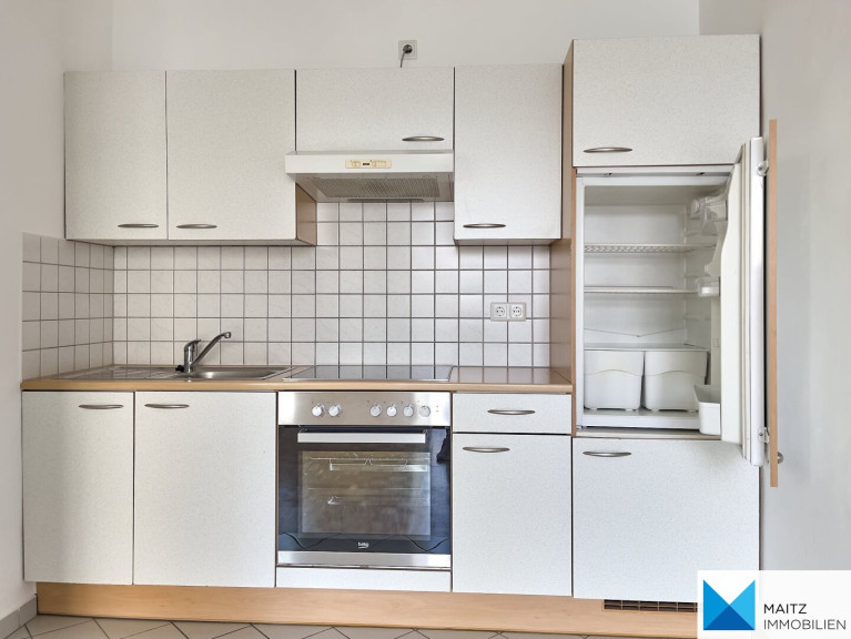 Die Küche ist mit Spüle, E-Herd, Dunstabzug, Kühlschrank und Küchenkästen ausgestattet. Kein Geschirrspüler.