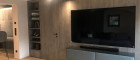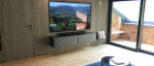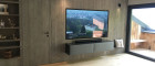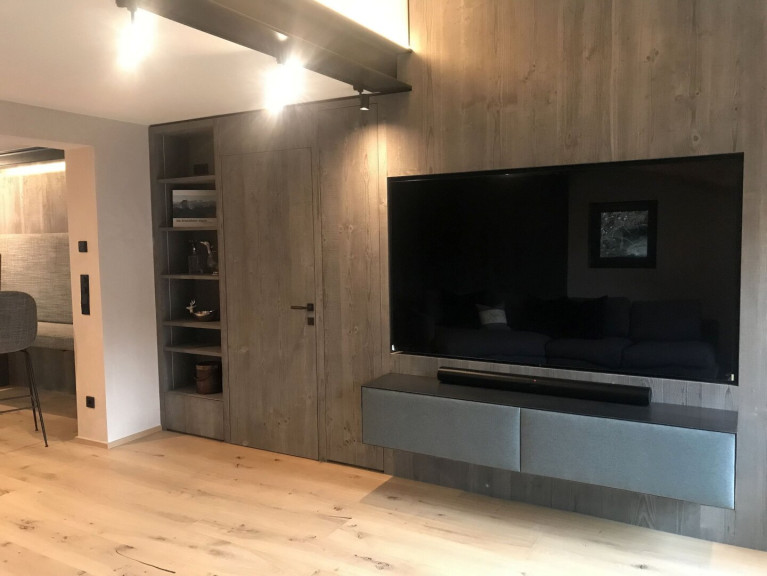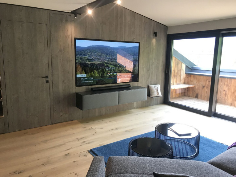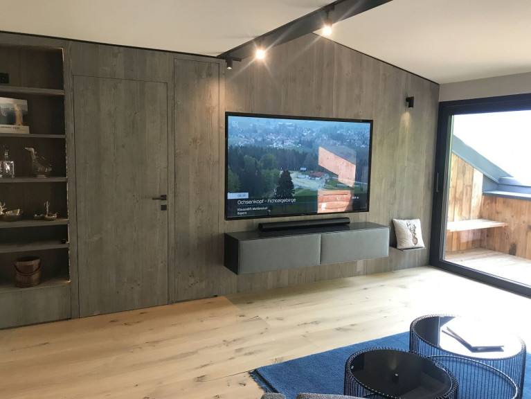 Der große LG-Fernseher (185 cm x 100 cm) mit Sonos-Soundbar und Hängeregal aus Metall mit Lodenbezug fügt sich perfekt in die Altholzwand ein und bietet ein außergewöhnliches Kinoerlebnis. Die große, gemütliche Rolf Benz-Couch, die edel-anmutenden, gehobelten Eichendielenböden in den Wohnräumen mit integrierter Fußbodenheizung und der schöne Blick auf den offenen Kamin schaffen ein wohliges Wohnfühlgefühl an kalten Tagen.