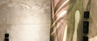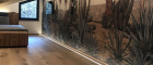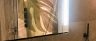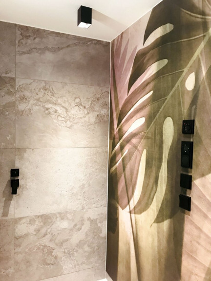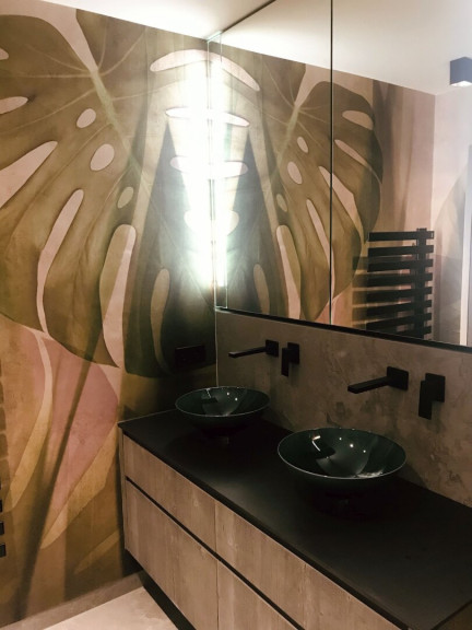 - Badezimmer mit Doppelwaschbecken, bodengleicher Dusche mit Rainshower, Ital. Armaturen und floraler Wandgestaltung