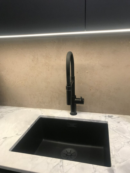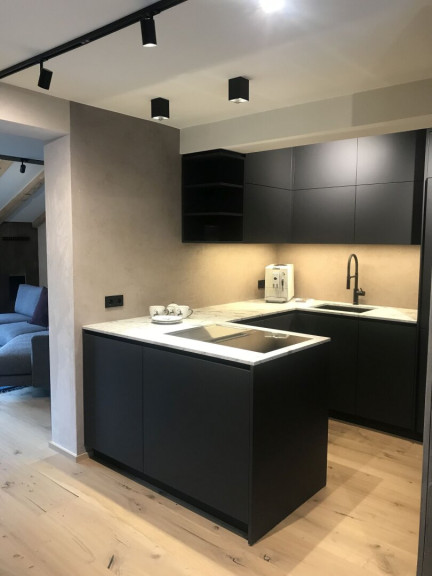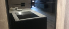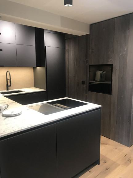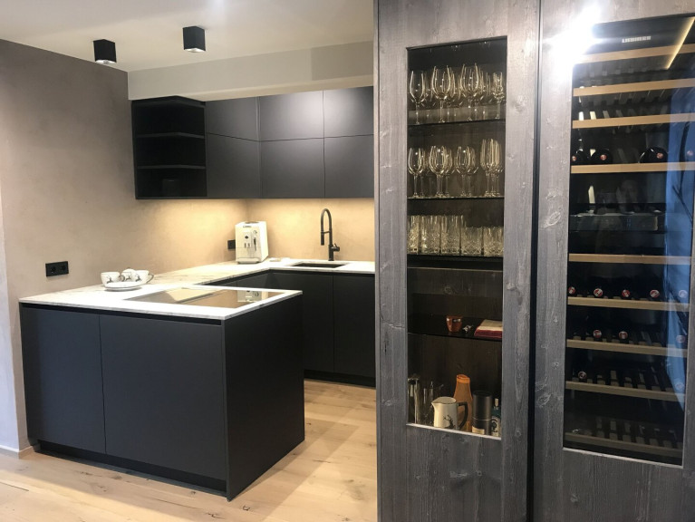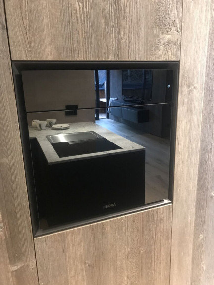 Die Küche mit ihren hochwertigen Markengeräten - Bora, Liebherr und Bosch - erfreut Profi- wie Hobbyköche gleichermaßen. Mit dem Bora-Dampfgarer mit integriertem Backrohr - empfohlen von Starköchen - können Sie zu Hause auf Sterneniveau kochen. Mit dem Teppan Yaki, dem Luxusgut unter den Küchengeräten, können Sie Fisch, Fleisch und Gemüse knackig anbraten – ähnlich wie beim Profi im Restaurant. Der Bora-Abzog sorgt dabei für gefilterte Luft. Die Speis - Abstellraum mit Altholz-Schiebetüre - bietet ausreichend Stauraum, auch für die darin befindliche Waschmaschine. Die Arbeitsplatte aus Naturstein und die Wände aus Terrastone-Steinputz verleihen der Küche eine ganz besondere Atmosphäre und komplettieren die edle Anmutung.