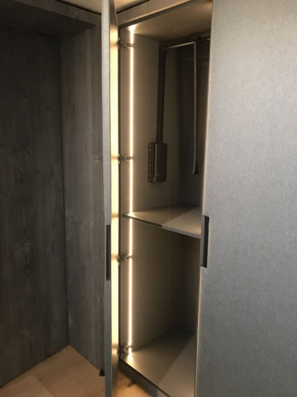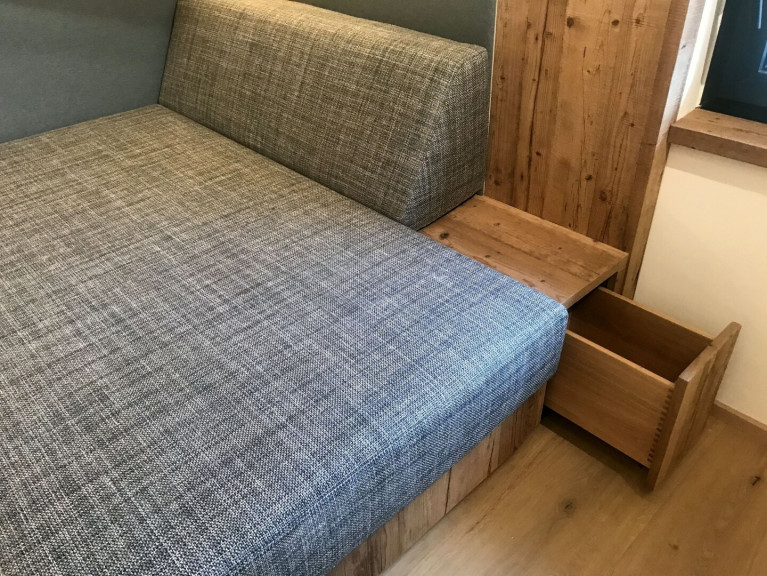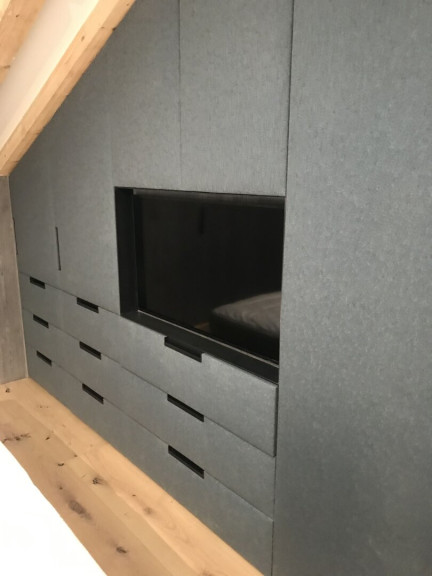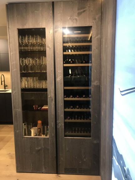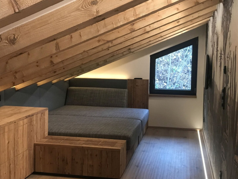 Das Dachgeschoß-Top wurde auf beiden Ebenen von einheimischen Tischlern und Innenausstattern mit edlen, grauen bzw. braunen Altholz-Elementen in Kombination mit Loden veredelt. Die Altholz-Türen mit schwarzen Beschlägen fügen sich harmonisch in die Altholz-Fronten ein. Die Tischlermaßküche wurde ebenso in die Gesamtkonzeption integriert und besteht zu einem Teil aus Altholz. Der bodengleiche Weinkühlschrank und die mit LED-beleuchtete Glasvitrine mit ausziehbarem Board bieten alles, was man für einen gemütlichen Abend mit Freunden benötigt.