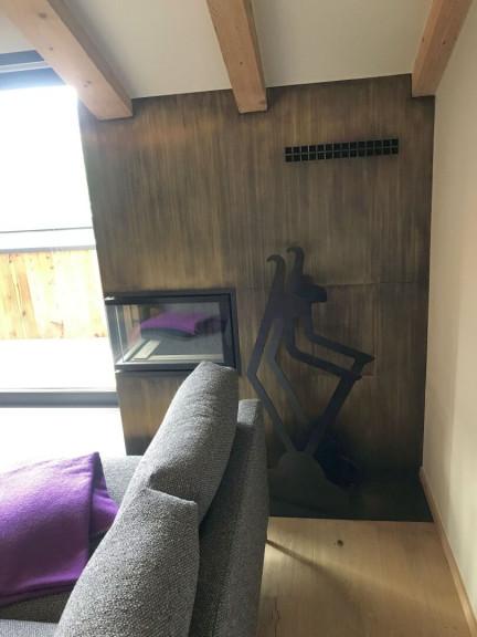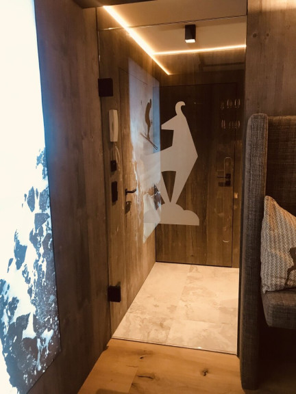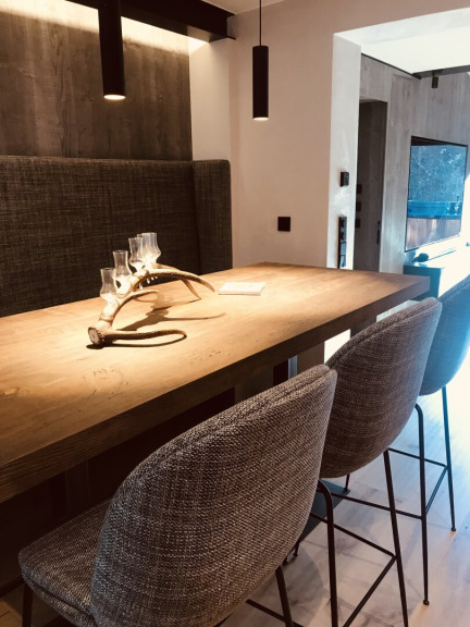 Betritt man das vollmöblierte und luxuriös, ausgestattete Penthouse erwartet Sie im Eingangsbereich eine maßgeschneiderte Garderobe aus Altholz mit Loden-Sitzbank, stylisch-praktischen Gams-Hacken, und mit Metall umrahmten und beleuchteten Ablagefächer. Durch die Glastüre betritt man das Herzstück - die offene Wohnküche mit dem Hochbar-Esstisch und dem angeschlossenen Wohnbereich mit offenem Kamin und Ausgang auf die Dachterrasse.