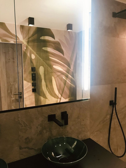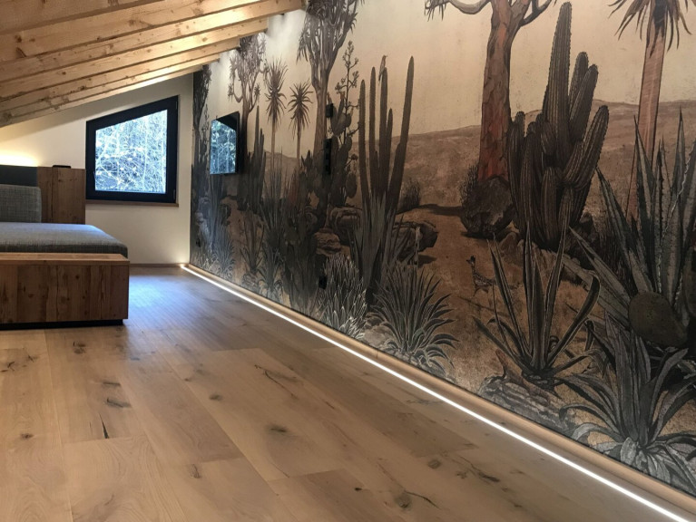 Das Masterschlafzimmer verfügt über durchdachte Garderobenelemente mit Lodenfronten und einen integrierten Fernseher. Weiters befindet sich auf dieser Ebene das Badezimmer mit Altholz-Waschtisch, Doppelwaschbecken mit italienischen Armaturen der Marke Fantini sowie bodengleicher Dusche mit Glaswand und Rainshower, schwarzem Handtuchtrockner und integriertem Radio. Die außergewöhnliche Wandgestaltung in Form einer bedruckten Tapete bildet hier das florale Highlight.