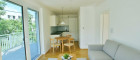 entrance area, a living-dining room with a fully equipped open kitchen with access to the balcony, one bedroom, a bathroom with tub and washing machine connection, a storage room and a separate toilet.