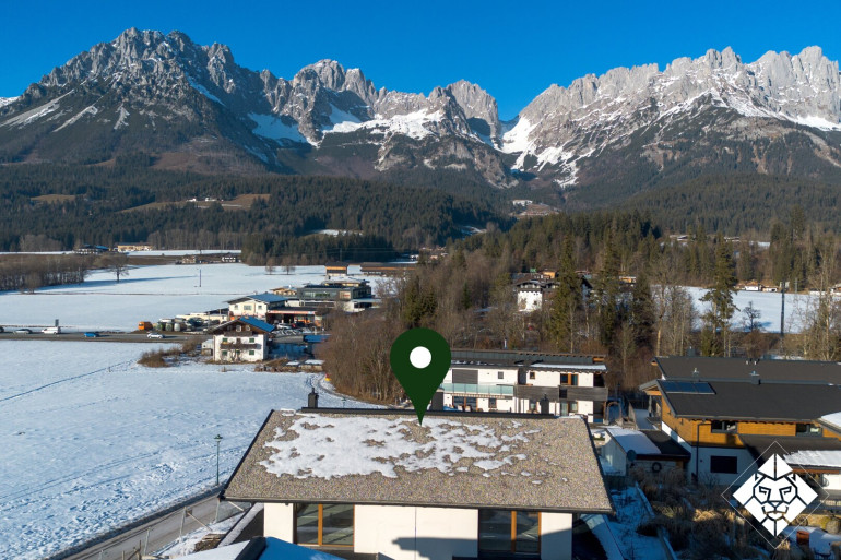 Hier oben fühlt sich jeder willkommenen, warmen Materialien, ein Holzofen, eine vollausgestattete Küche, sowie eine Wohnlandschaft sind unter dem massiven Sichtdachstuhl in einem völlig offenen Raum vereint und blicken gemeinsam durch Panoramafenster auf das Highlight - den Wilden Kaiser. Dieser Ausblick begleitet Sie immer, unverbaubar bei allem, was Sie in diesem Haus machen. Egal, ob Sie in der Lese-ecke die Lesebrille auf der Nasenspitze sitzen habend mit einem leichten Blick über den Brillenrahmen nach oben schauen, oder beim Frühstückskaffee und frischem Brötchen in Gedanken schwelgen, Sie sehen den Kaiser! Noch näher kommen Sie diesem, wenn Sie die großen, massiven Schiebefenster bei sternenklarer Nacht öffnen und auf den riesigen Balkon gehen, um mit Ihrem Partner auf die gelungene Kaufentscheidung anzustoßen. Alles richtig gemacht.