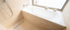 Das hochwertige Badezimmer verfügt über eine Badewanne, einen Spiegelschrank, indirekte Beleuchtung und eine separate Regendusche.