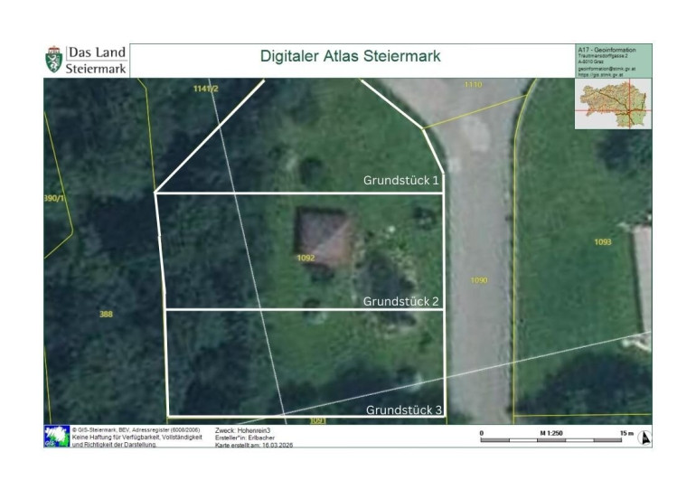 Zum Verkauf stehen drei neu geschaffene Grundstücke (Teilung aus Gst. Nr. 1092) in idyllischer Grünlage gegenüber der Hohenrainstraße 136, 8042 Graz.
