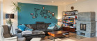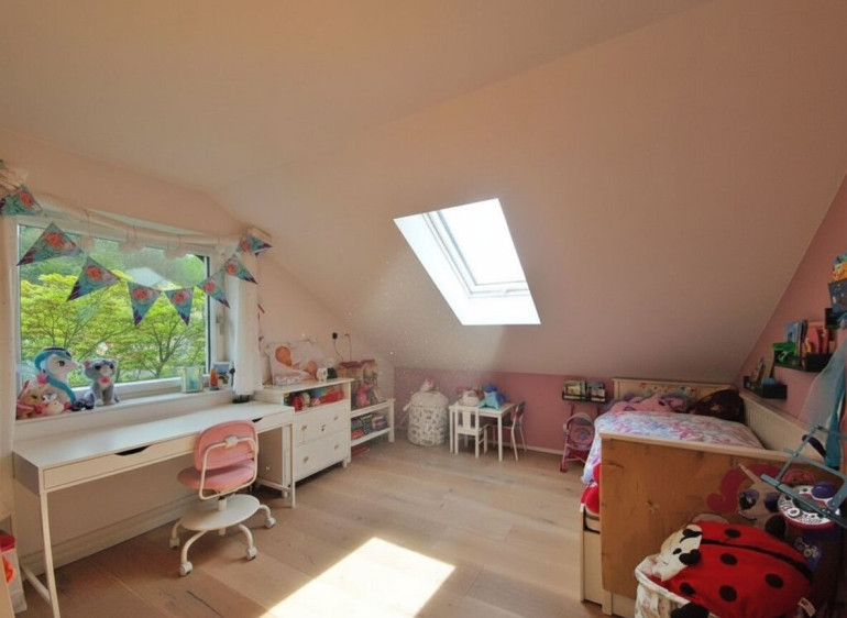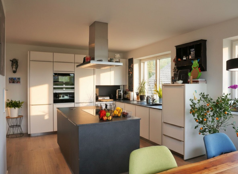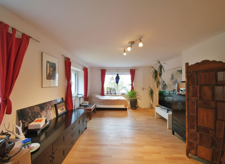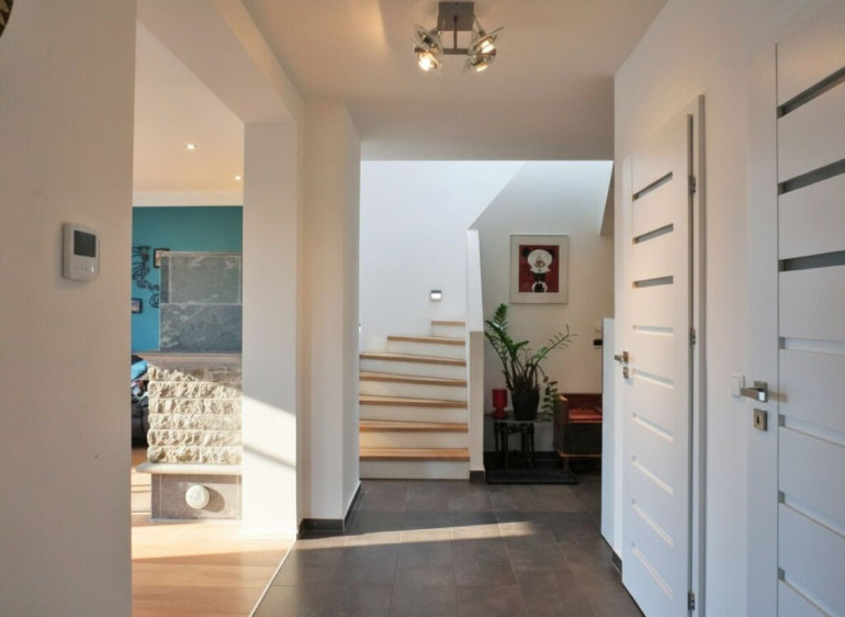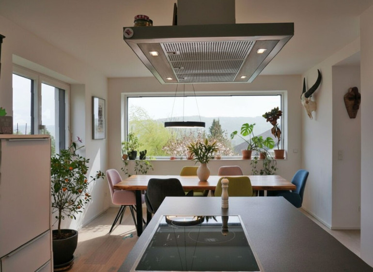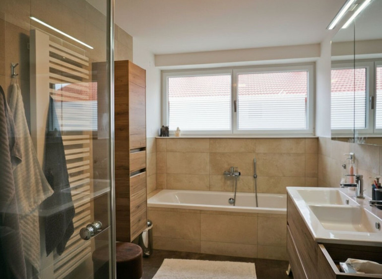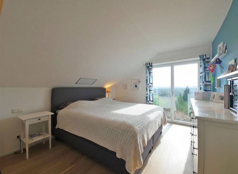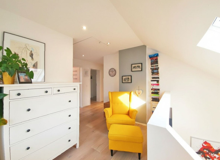 Die Wohnfläche von ca. 212 m² verteilt sich auf drei Ebenen. Das Erdgeschoß mit dem Hauseingang liegt auf Straßenniveau und wird dominiert von dem offenen Wohn-Küchenbereich mit Ausgang auf die vorgelagerte Terrasse sowie einem Übergang auf eine weitere, überdachte Terrasse. Weiters gibt es, über den zentralen Vorraum erschlossen, ein Büro, ein WC und einen Abstellraum. Das Dachgeschoß unterteilt sich in einen zentralen Vorraum, drei Zimmer sowie in das große Familienbad und ein separates WC. Im Gartengeschoß sind nicht nur Heizraum und Keller untergebracht, sondern auch zwei große Wohnräume, ein Duschbad sowie die Sauna und ein Ausgang direkt auf die Terrasse und in den Garten.