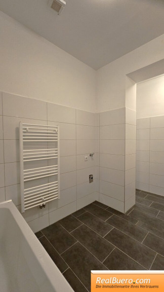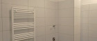 - Badezimmer mit Wanne, Handwaschbecken, Handtuchtrockner, Waschmaschinenanschluss, Toilette