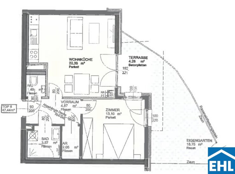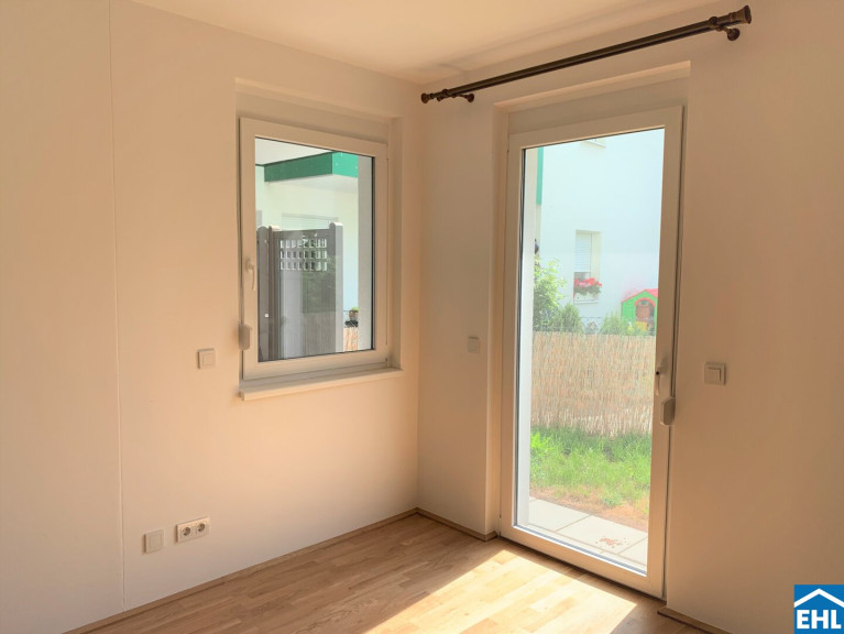 Die Wohnung selbst unterteilt sich in eine großzügige Wohnküche mit Küchenzeile, ein getrennt begehbares Schlafzimmer, ein Badezimmer mit Dusche und Waschmaschinenanschluss, eine separate Toilette, sowie einen Vor- und Abstellraum. Das Highlight der Wohnung ist der großzügige Eigengarten mit Terrasse!