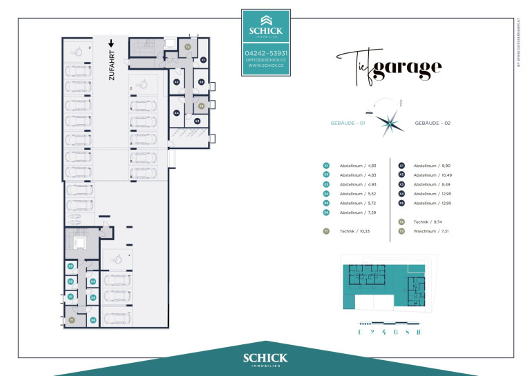 Tiefgarage mit Stellplätzen für Autos und Motorräder