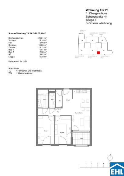 Die Wohnung selbst befindet sich in der 1. Etage und verfügt über eine großzügige Wohnküche mit vollausgestatteter Einbauküche und Zugang zur Loggia, 2 Schlafzimmer, ein Badezimmer mit Badewanne und Waschmaschinenanschluss, ein separates WC, sowie einen Vorraum. Die dazugehörige Loggia lädt zum gemütlichen Verweilen ein und rundet das Wohnerlebnis perfekt ab!