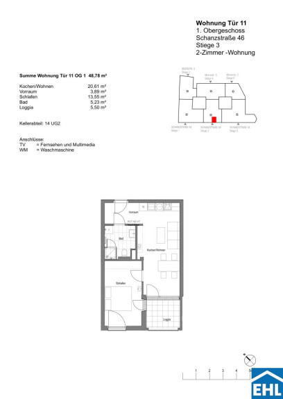 Die Wohnung selbst befindet sich in der 1. Etage und verfügt über eine großzügige Wohnküche mit vollausgestatteter Einbauküche und Zugang zur Loggia, ein getrennt begehbares Schlafzimmer, ein Badezimmer mit Dusche, WC und Waschmaschinenanschluss, sowie einen Vorraum. Die dazugehörige Loggia lädt zum gemütlichen Verweilen ein und rundet das Wohnerlebnis perfekt ab!