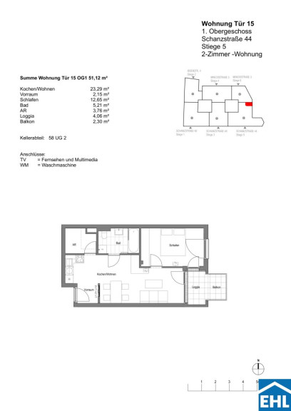 Die Wohnung selbst befindet sich in der 1. Etage und verfügt über eine großzügige Wohnküche mit vollausgestatteter Einbauküche und Zugang zur Loggia, ein getrennt begehbares Schlafzimmer ebenfalls mit Zugang zur Loggia, ein Badezimmer mit Badewanne, WC und Waschmaschinenanschluss, einen Abstellraum, sowie einen Vorraum. Die dazugehörige Loggia lädt zum gemütlichen Verweilen ein und rundet das Wohnerlebnis perfekt ab!