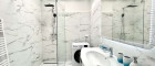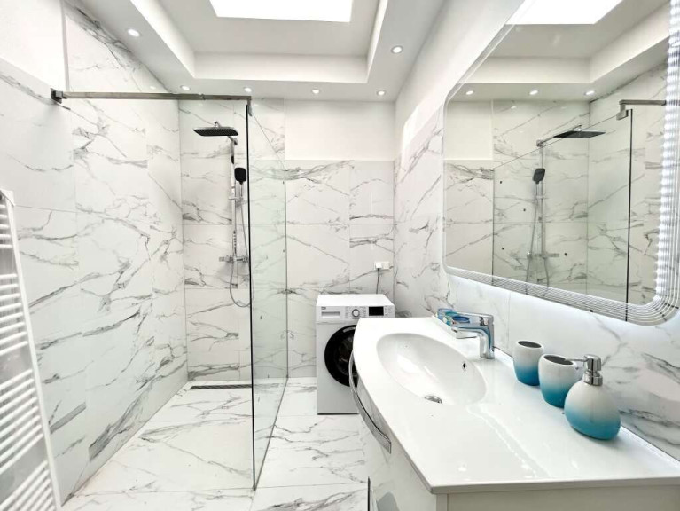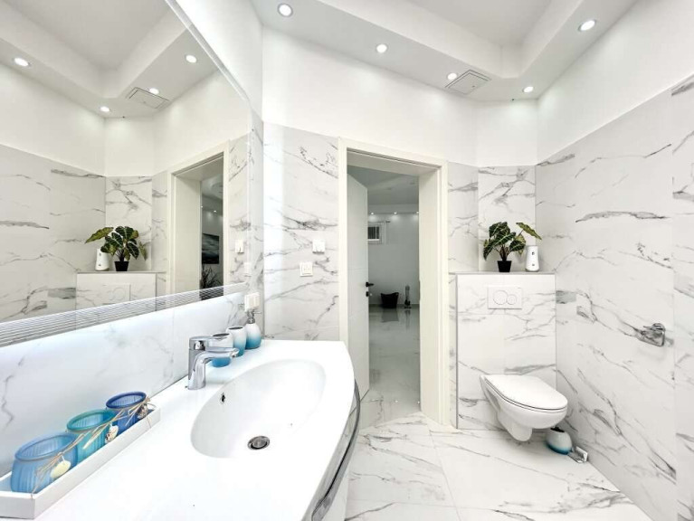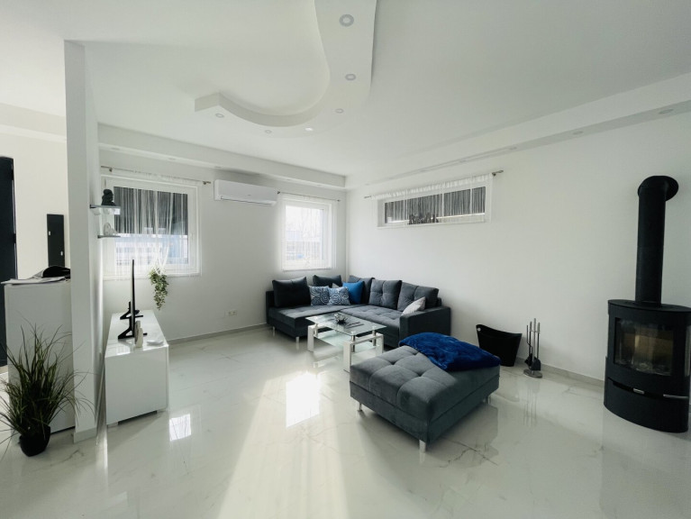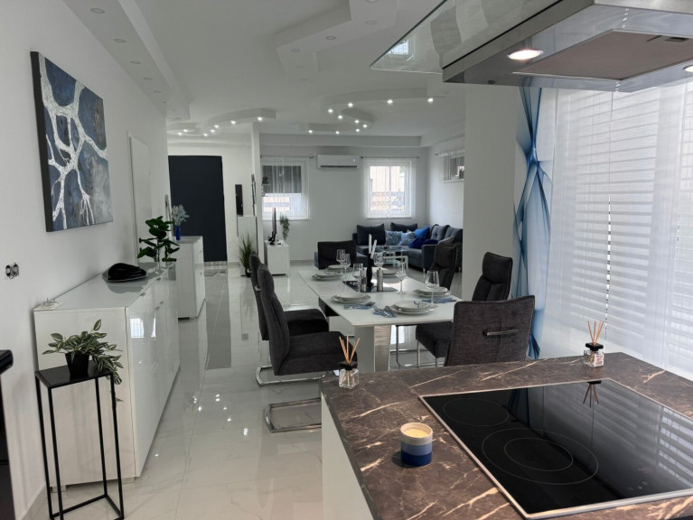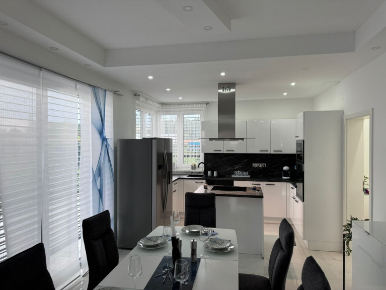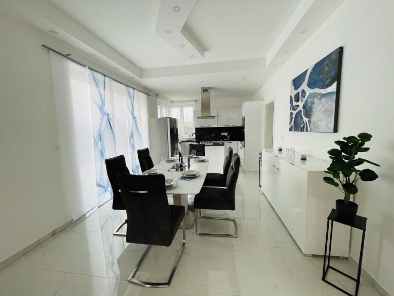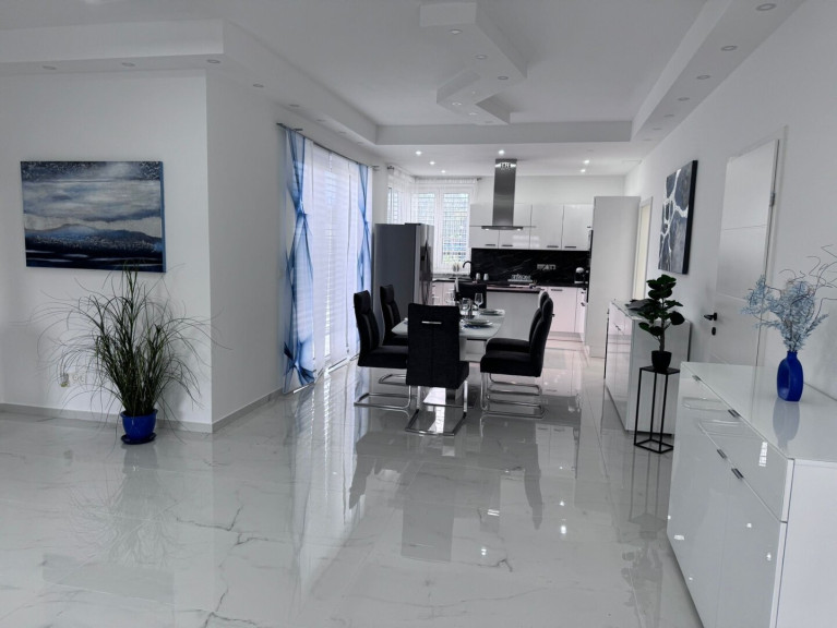 Diese moderne und elegant eingerichtete Immobilie besticht durch ein durchdachtes Design mit hochwertigen Materialien und stilvollen Akzenten. Der offene Wohn- und Essbereich verbindet luxuriöse Elemente mit einem gemütlichen Ambiente. Die große, voll ausgestattete Küche mit edler Marmor-Arbeitsplatte und modernem Induktionskochfeld lädt zum Kochen und Verweilen ein.