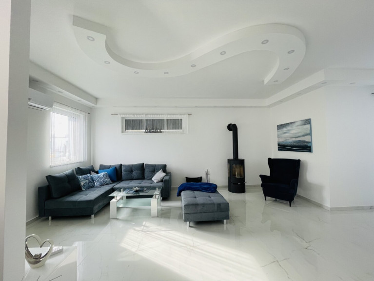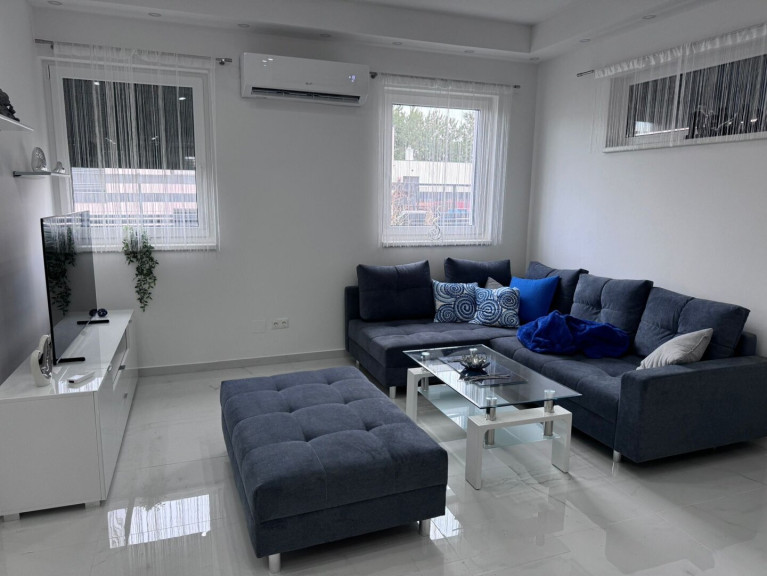 Der Wohnbereich mit einer hochwertigen Sofalandschaft ist perfekt zum Entspannen und Genießen. Große Fenster lassen viel Tageslicht in den Raum, während moderne Vorhänge für Privatsphäre sorgen. Dezente Wandkunst und stilvolle Dekorationselemente verleihen der Immobilie ein einzigartiges Flair.