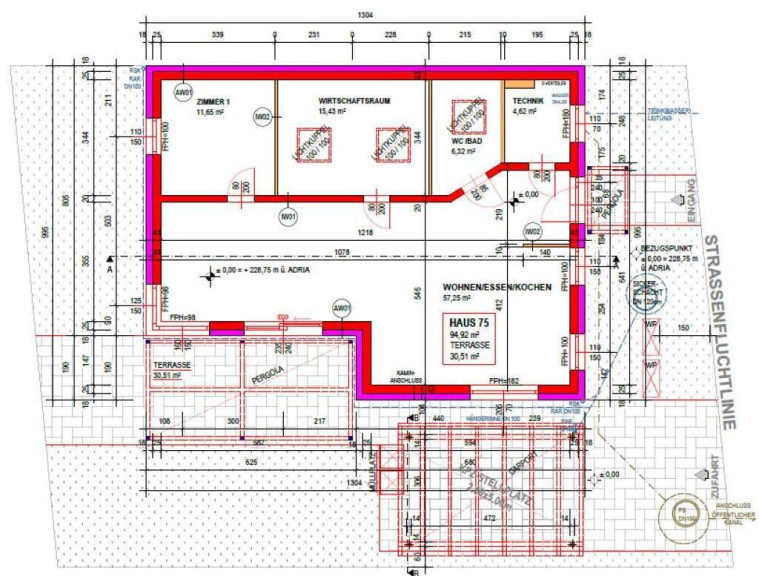 - Wandaufbau - 25cm Porotherm Ziegel mit 16cm Vollwärmeschutzfassade