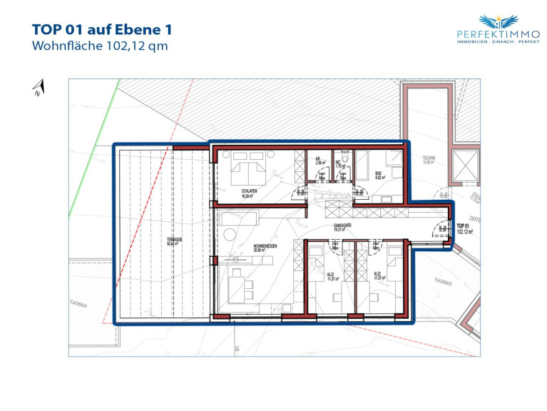 Auf der Ebene 1 liegen die Wohnungen Top 1 und Top 2. Beide Wohnungen verfügen jeweils über eine sehr großzügige Terrasse. Auch der allgemeine Technikraum befindet sich auf Ebene 1.