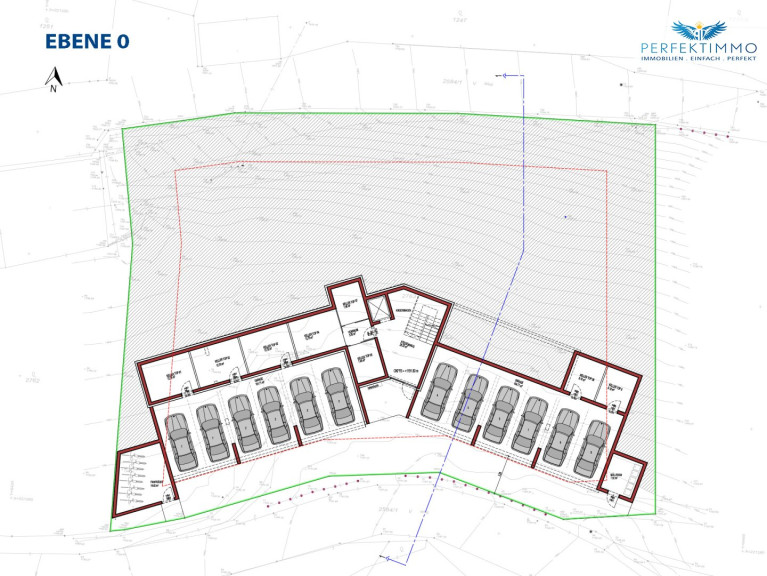 Auf Ebene 0 befinden sich die überdachten Stellplätze, wobei davon jeweils zwei benachbarte Stellplätze den Tops 1, 2, 3 und 4 zugeordnet sind. Hier befinden sich auch die E-Ladestationen. Auch die Kellerabteile, ein allgemeiner Fahrradraum und der Müllraum sind in Ebene 0 situiert. Im Stiegenhaus ist ein Bereich fürs Abstellen von Kinderwägen vorgesehen. Die Briefkästen für die Tops 1 bis 4 sind auch hier untergebracht.