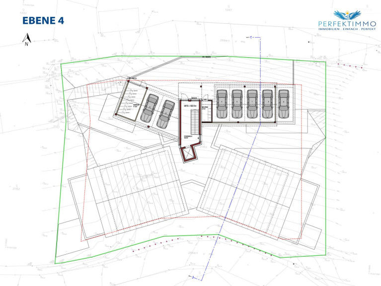 Auf Ebene 4 befinden sich vier den Wohnungen Top 5 bis Top 8 zugewiesene Stellplätze sowie drei Besucherparkplätze. Ein weiterer Fahrradraum und ein weiterer Müllraum sind hier ebenfalls vorgesehen. Die Briefkästen für die Tops 5 bis 8 befinden sich ebenfalls auf Ebene 4.