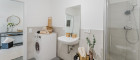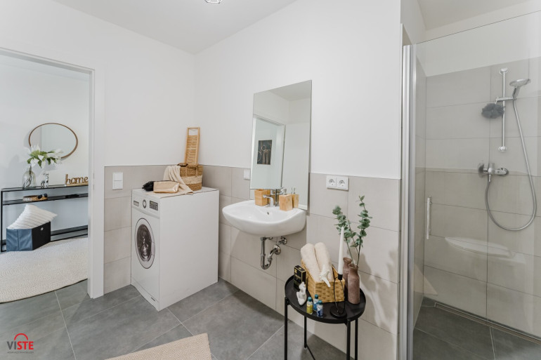 Badezimmer mit bodenebener Dusche, WC, Waschbecken und Waschmaschinenanschluss