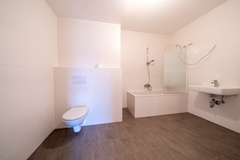 Das modern verflieste Badezimmer verfügt über eine Badewanne, diese bietet Ihnen den idealen Rückzugsort nach einem langen Tag. Des Weiteren befinden sich ein Handwaschbecken, ein WC und ein Waschmaschinenanschluss im Badezimmer.