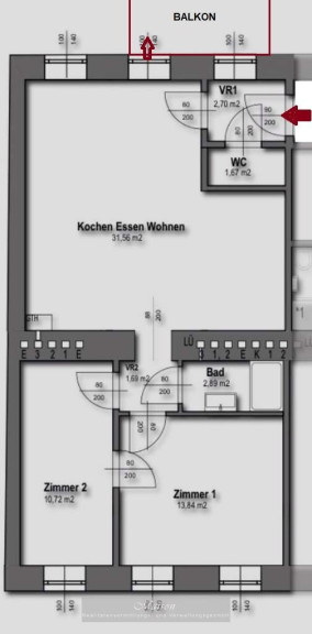 Vom Vorraum gelangt man direkt in das Wohnzimmer, welches das Zentrum der Wohnung bildet, mit Ausgang auf den hofseitigen Balkon, mit keinem unmittelbaren vis-à-vis.