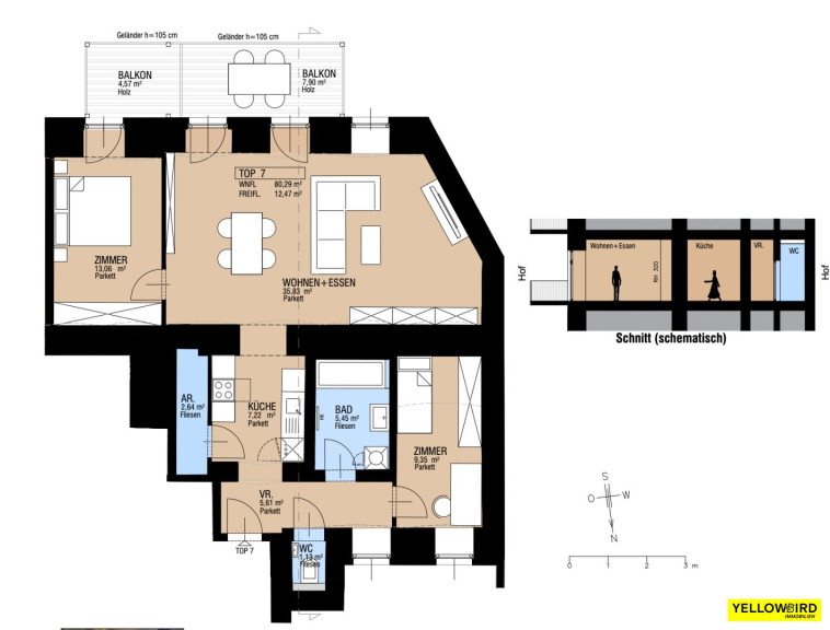 Fliesen, Parkett, Zentralheizung, Personenaufzug, Ostbalkon, Badewanne, Dusche