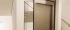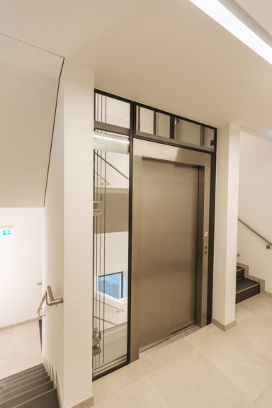 - Aufzug mit einem teilweise verglasten Schacht, Aufzugskabine in Edelstahl mit raumhohem Spiegel und LED-Leuchtpaneeldecke