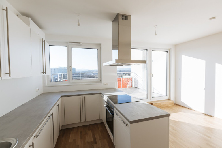 Die Wohnung ist nicht nur mit einer Freifläche ausgestattet, sondern weißt auch hochwertige Materialien als auch Ausstattung aus: