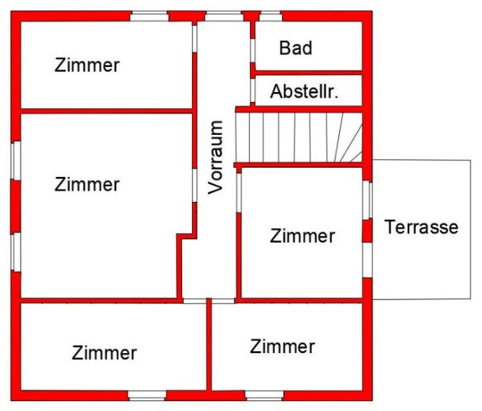 Im Obergeschoß befinden sich fünf helle und gemütliche Zimmer (eines davon mit direkten Dachterrassenzugang), die Ihnen ausreichend Raum zum Entspannen und Erholen bieten, sowie ein Badezimmer und ein Abstellraum.