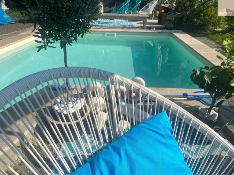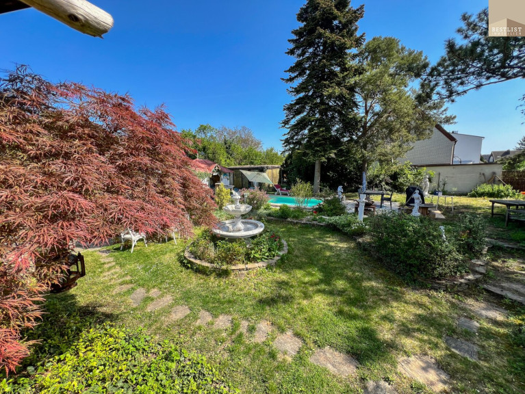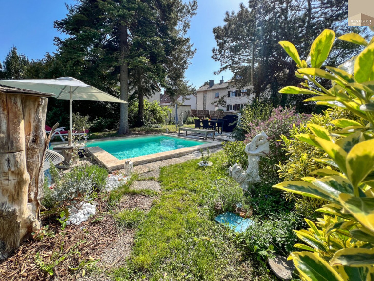 Der großzügige Garten ist ein echtes Highlight: Ein gemauerter Pool sorgt an heißen Tagen für Erfrischung, die Gartenanlage lädt zum Entspannen, Spielen oder Gärtnern ein.