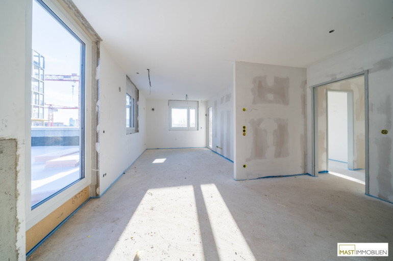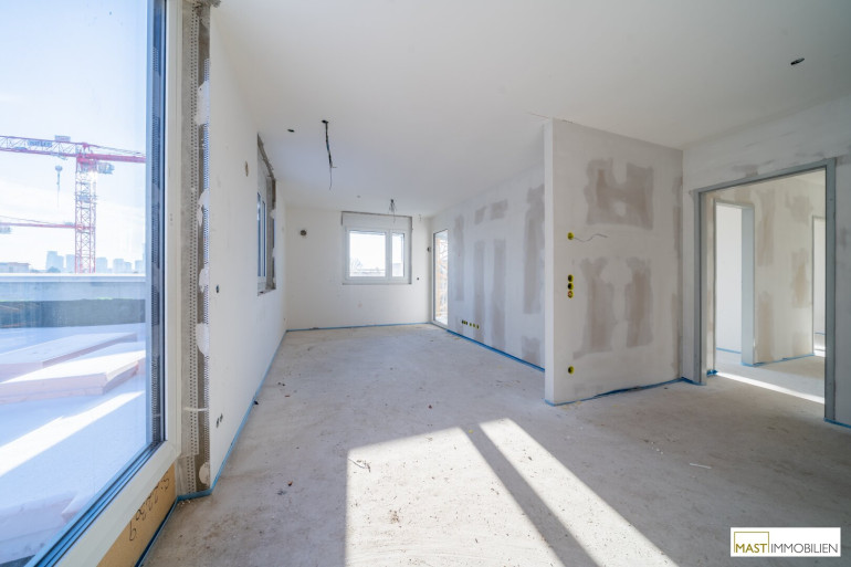 Die Wohnung befindet sich im 3. Liftstock und verfügt über 65,69 m² Wohnfläche + einen 7,66 m² großen Dachgarten + eine 18,46 m² große Terrasse + eine 23,05 große südlich ausgerichtete Loggia/Balkon.