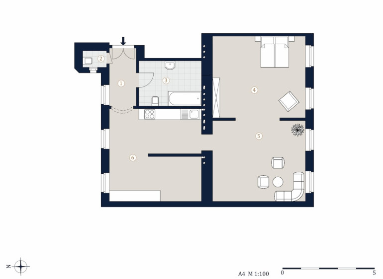 Sie betreten die Wohnung und gelangen in einen Vorraum, von hier gelangen Sie links in das Badezimmer welches mit einer Badewanne, Dusche und Waschmaschinenanschluss ausgestattet ist. Durch den Voraum gelangen Sie in die Küche mit Küchenzeile und einem anschließenden Wohn- / Essbereich. Von hier haben Sie Zugang zum Wohnzimmer und zum Schlafzimmer von dem man auch in das Badezimmer gehen kann. Das separate WC finden Sie beim Eingang der Wohnung.
