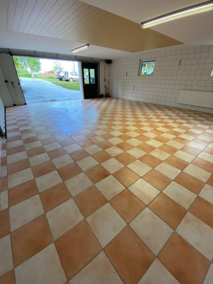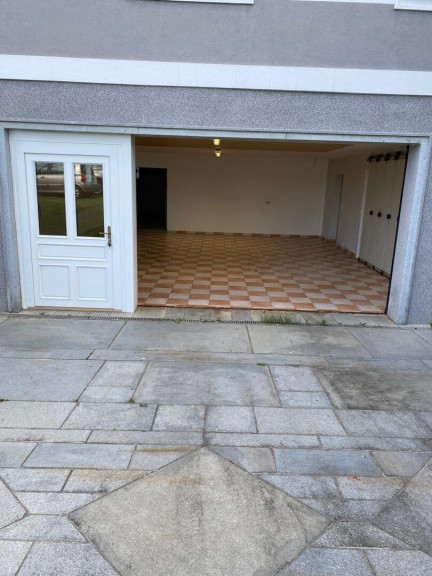 Über eine Eingangstür und ein seitliches Sektionaltor erreicht man ebenerdig eine 60 m² große Garage, welche für mehrere Nutzungen geeignet ist,