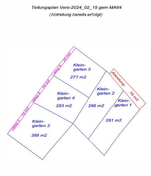 Die aus insgesamt 5 Parzellen bestehende Liegenschaft ist 1.585m² groß und kann in verschiedenen Varianten geteilt werden. Angeboten wird hier ein ca. 577m² große Liegenschaftsteil, das Teilstück B, das aus 2 frisch parzellierten Einzelgrundstücken, im Ausmaß zwischen 281 und 296m² besteht, die alle die Widmung Kleingarten für ganzjähriges Wohnen haben.