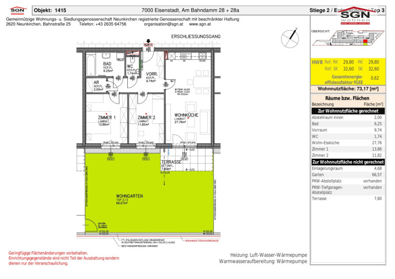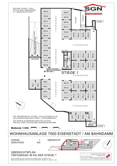 Zur Wohnung sind der PKW-Abstellplatz Nr.: 23 und der PKW-Tiefgaragenplatz Nr.: 29 zugehörig, sowie ein Einlagerungsraum mit rd. 4,7 m².