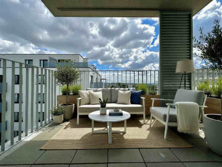 Die hochwertigen, freifinanzierten und bezugsfertigen Eigentumswohnungen bieten 2-3 Zimmer mit einer Wohnflächen zwischen 49m² bis 65 m². Jede Einheit überzeugt mit großzügigen privaten Außenbereichen.